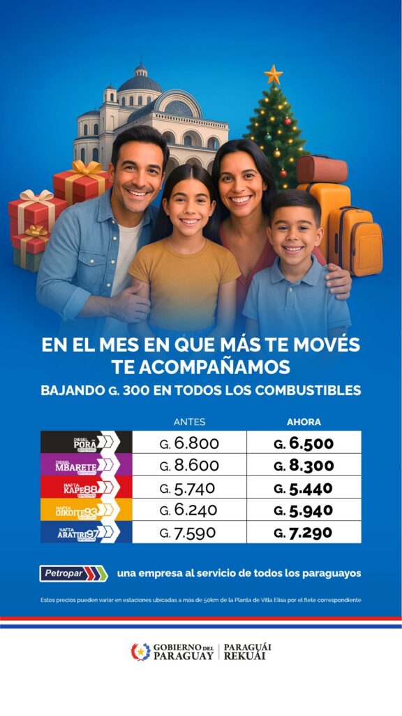 El presidente de la República, Santiago Peña, confirmó una nueva reducción de G. 300 en todos los combustibles comercializados por Petropar, medida que rige desde este 1 de diciembre y que impacta de forma directa en el bolsillo de los consumidores.