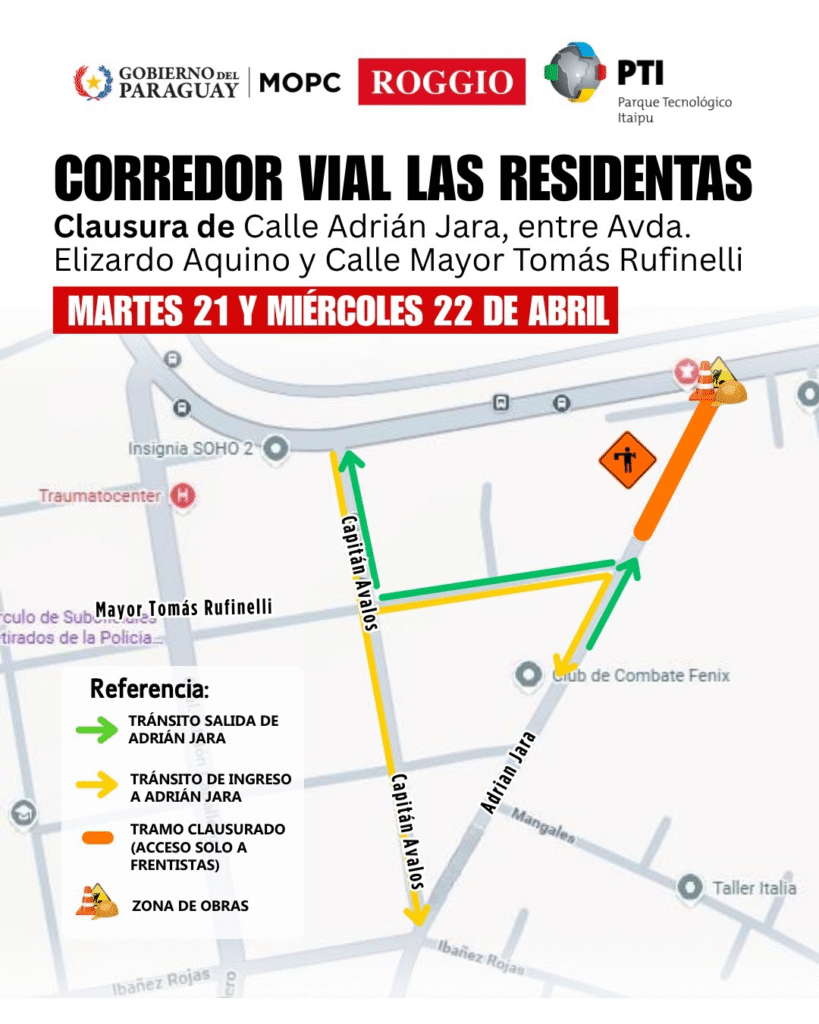 La intervención contempla la instalación de alcantarillas, por lo que la calle Adrián Jara permanecerá cerrada durante ambas jornadas. No obstante, la circulación sobre la avenida principal seguirá habilitada, mientras que el acceso por esa calle quedará restringido únicamente para residentes.