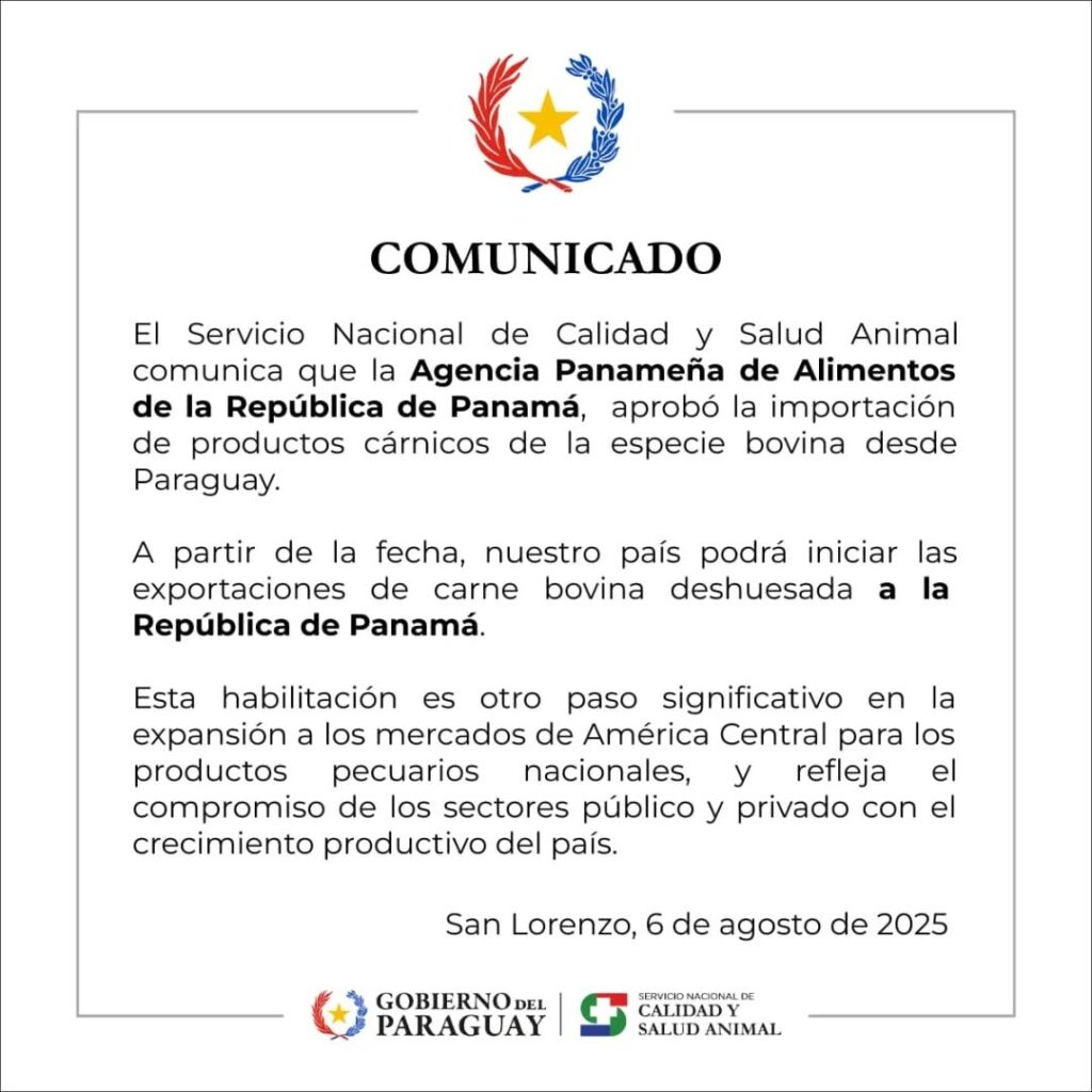 La carne bovina paraguaya alcanza un nuevo destino tras la habilitación oficial otorgada por la Agencia Panameña de Alimentos que autoriza la importación de este producto cárnico desde Paraguay, lo que marca un avance clave en la expansión comercial del sector ganadero nacional en mercados de Centroamérica.