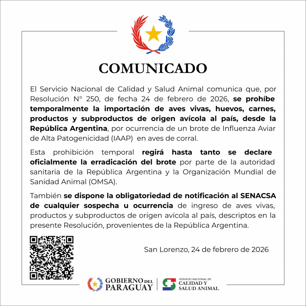 La institución prohibió desde este 24 de febrero el ingreso de aves vivas, huevos y todo tipo de carne o subproductos de origen avícola provenientes de Argentina. Esta decisión se oficializó mediante la Resolución N° 250, como respuesta directa ante la detección de un brote de Influenza Aviar de Alta Patogenicidad (IAAP) en aves de corral dentro del territorio argentino.