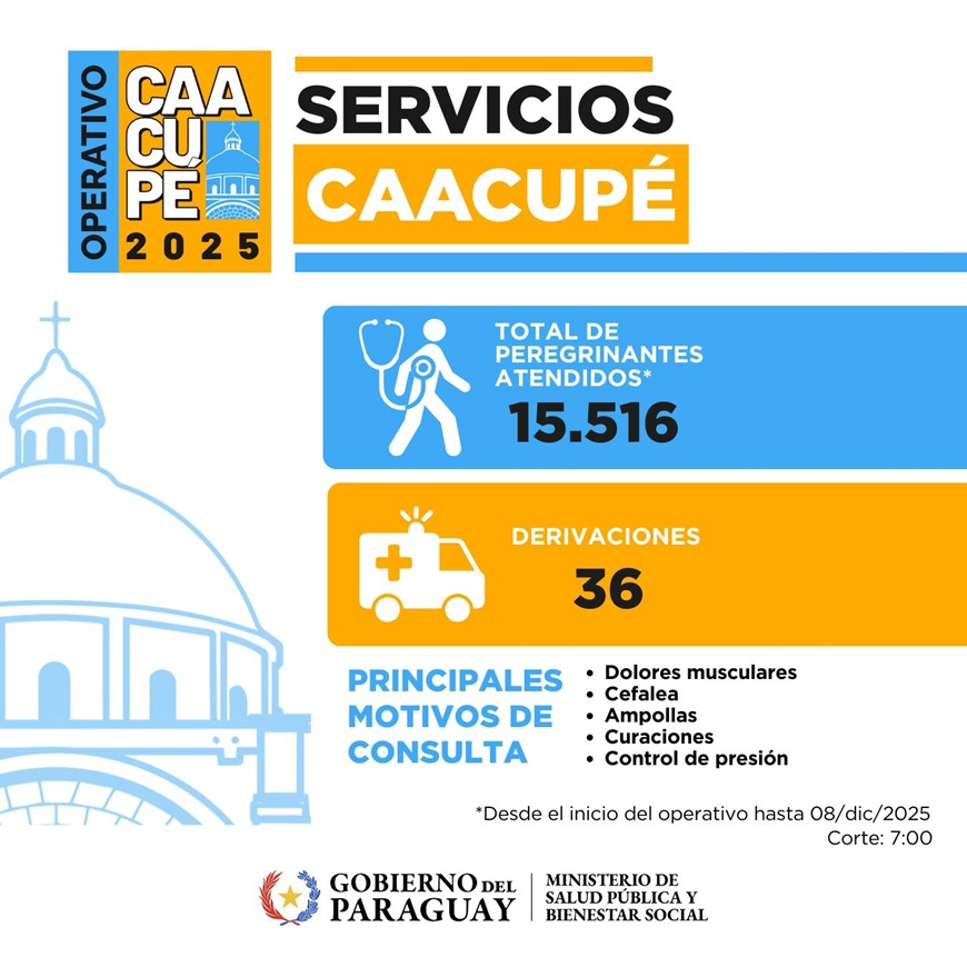 El Ministerio de Salud confirmó que un total de 15.516 feligreses recibió atención médica en los puestos fijos y provisorios desplegados para el Operativo Caacupé 2025, cifra que continuará en aumento conforme más peregrinantes lleguen a la Basílica.