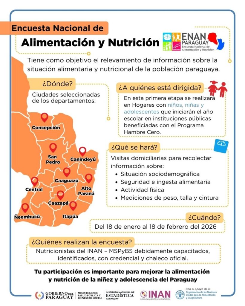 Después de seis décadas, Paraguay vuelve a medir de forma integral la situación alimentaria y nutricional alimentaria de su población con el inicio de la Encuesta Nacional de Alimentación y Nutrición (ENAN), un estudio que busca generar datos clave para orientar políticas públicas y programas sociales en el país.